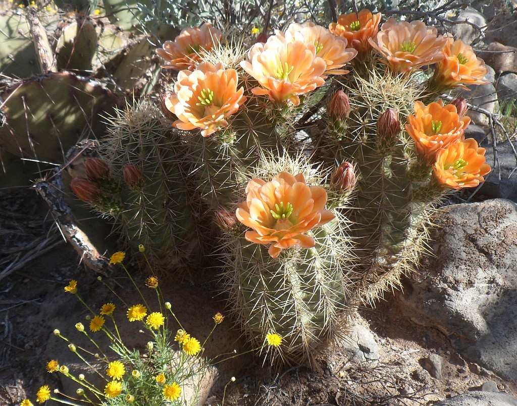 Larry encountered this flowering cactus on my exploration of the 100 geocaches spread over the desert south of Alamogordo. It is different from the crimson flower.