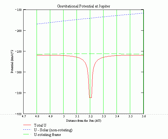 Also note the curvature in the Potential of the rotating frame, with a maximum at Jupiter, this is essentially a tidal force.