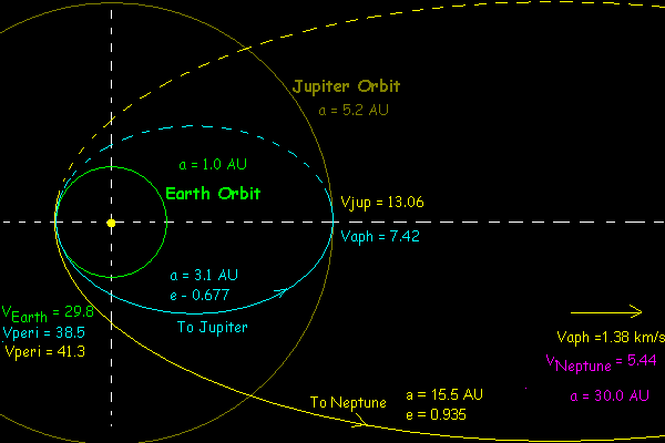 The Minimum Energy Orbits to travel to Jupiter and Neptune are shown in the diagram below.